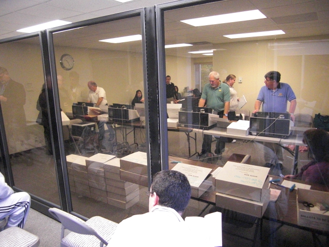 Both candidates watched through a glass partition yesterday (Dec. 11) as seven employees of two firms, Intraform and Martin & Chapman, ran ballots through electronic counting machines under the eye of seven CalPERS employees.