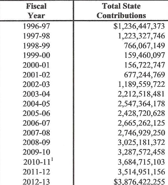 CalPERS dropped the state rate from $1.2 billion in 1997-98 to less than $160 million in 1999-00 and 2000-01. A booming market yielded a brief surplus, and CalPERS spread the wealth by sponsoring a major state worker pension increase, SB 400 in 1999.