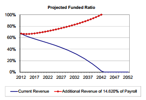 In the view of experts mentioned at CalPERS, if public pension funding levels fall below a certain point, 40 percent or possibly even 50 percent, reaching full funding would require big rate increases that are politically and financially impractical.