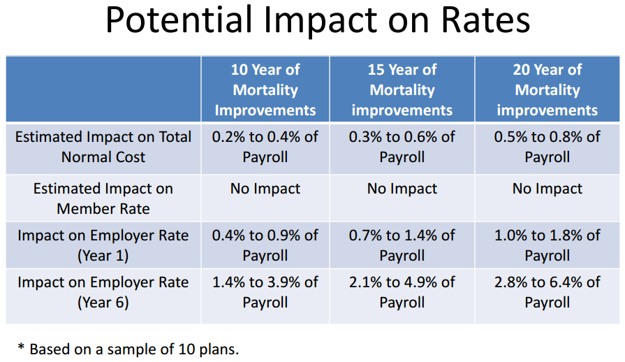 In the sample of potential rate increases from mortality improvements, there is “no impact” on member or employee contributions. The normal cost increases, but not by a full 1 percent.
