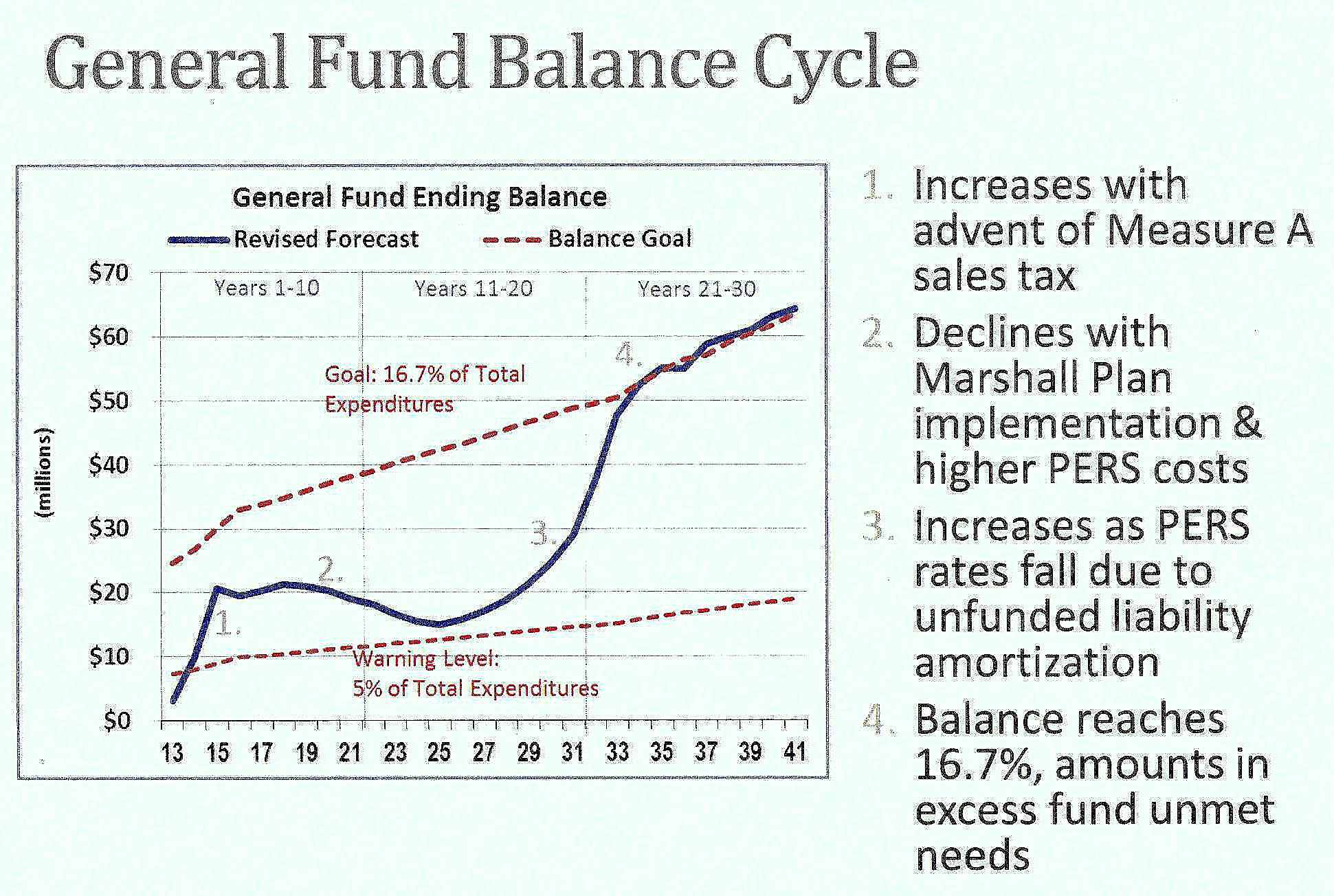 A chart in Wilson’s presentation to the council shows that pension costs are a main driver in projections that the Stockton general fund reserve will stay above a warning level of 5 percent, before climbing over three decades to the recommended goal of 17 percent.