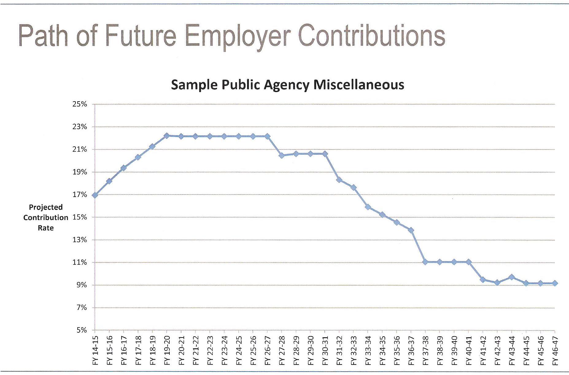 A chart with a simplified line shown the board last week (see below) projects rates for a typical miscellaneous plan increasing 5 percent of pay during the next five years, before leveling off for seven years and then steadily dropping for two decades.