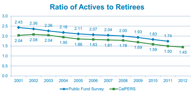 Adding to the CalPERS risk is the drop in the ratio of active workers to retirees from 2 to 1.5 in the last 10 years, increasing the size of the payroll bite if employer rates are raised after a big investment loss.