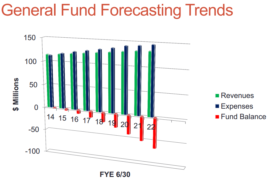 At a public bankruptcy update last month, San Bernardino officials said city retirement costs are expected to double during the next 10 years. And during the next eight years, general fund expenses are projected to grow faster than revenue.