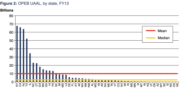 The total state unfunded liability (“unfunded actuarial accrued liability”) for retiree health care (“other post-employment benefits”) in fiscal 2013 was nearly $498 billion, or 3.25 percent of national gross domestic product, according to a report issued this month.