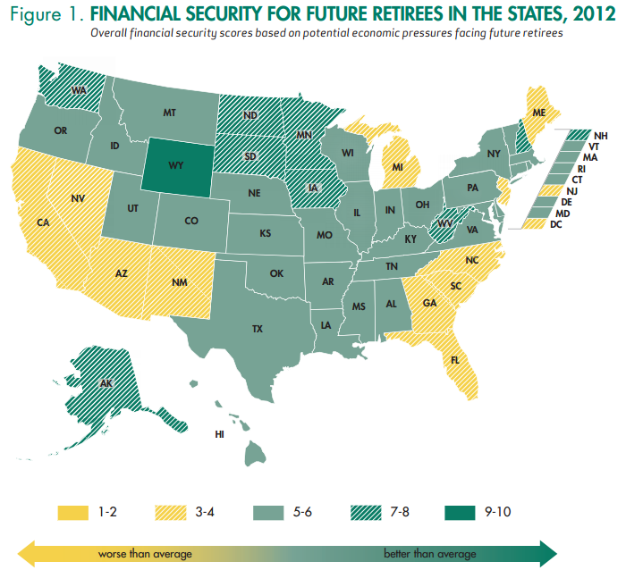 The scorecard uses eight measures of three key financial security factors: anticipated income, major costs such as housing and health care, and labor market conditions for older workers.