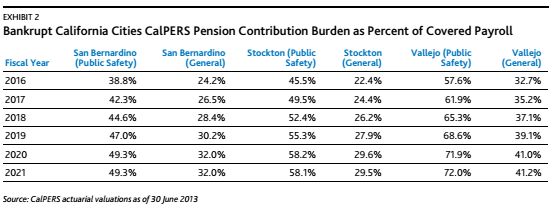 “San Bernardino’s choice to leave its accrued pension liabilities unimpaired means that its contribution requirements to CalPERS (see Exhibit 2) will likely increase to the point where they weaken the city’s financial profile, even after the relief provided by the bankruptcy adjustment,” said Moody’s. “This weakening is similar to what we expect to occur in both Stockton and Vallejo.”