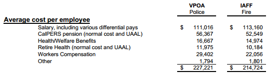 A budget chart (p. 165) shows the average Vallejo police salary, $111,016, is more than matched by pension, health care, workers compensation and other expenses that push the total cost for the average officer to $227,221. (See chart below)