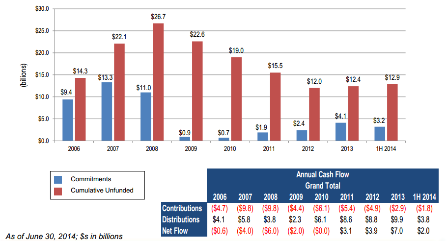 Buyouts were 61 percent of the total private equity portfolio valued at $31.3 billion, followed by “growth-expansion” style funds at 17 percent and “credit-related” at 12 percent.