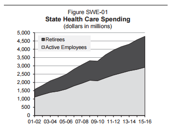 Another problem is that under the governor’s plan to pay down the unfunded liability, current state retiree health care costs (see chart below) would sharply escalate, tripling in today’s dollars in 30 years.