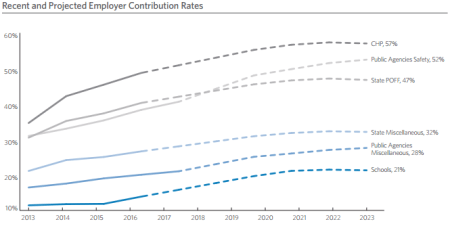 Responding to economic forecasts, not accounting theory, pension funds have lowered their forecasts. CalPERS and CalSTRS recently dropped their discount rates from 7.5 percent to 7 percent, increasing the need for more employer rate increases to fill the funding gap.