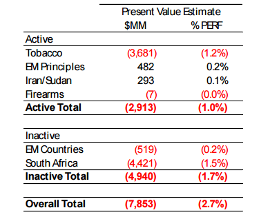 Since the sale of investments in firms doing business with apartheid South Africa in 1986, all CalPERS divestments have resulted in a total loss of $7.9 billion, including transaction costs and foregone investment returns, Wilshire consultants estimated earlier this year.