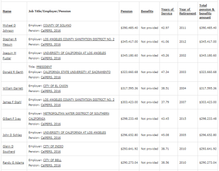 Top 10 CalPERS pensions in 2016 listed on Transparent California