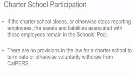 But for charter schools the old line is literally true. Current law does not allow termination of their CalPERS contract. When a charter school closes, the unpaid pension debt is covered by the large CalPERS pool mainly funded by regular schools.