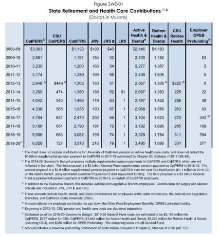 A Brown reform began building a pension-like investment fund to help “prefund” retiree health care costs in the future. State worker unions agreed in bargaining to make contributions to the the fund ranging from 1.4 to 4.6 percent of pay, matched dollar-for-dollar by the state.