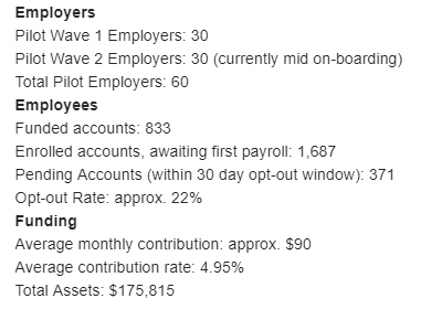 During a pilot that received its first contributions Jan. 3, CalSavers worked with 60 employers to test the program. Most of the results so far (see chart) are from the first wave of 30 employers and generally meet expectations, including the opt-out rate of 22 percent.