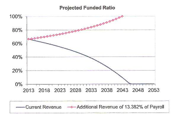CalSTRS AT THE CROSSROADS: No rate hike, pension fund depleted by 2046. Full rate hike, 100 percent funded in 30 years. (Milliman actuaries)