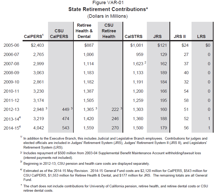 The chart shows retiree health care has been the fastest-growing state retiree cost, doubling in a decade. Nearly all of the $1.8 billion retiree health payment next fiscal year comes from a $108 billion general fund that pays for schools and other programs.